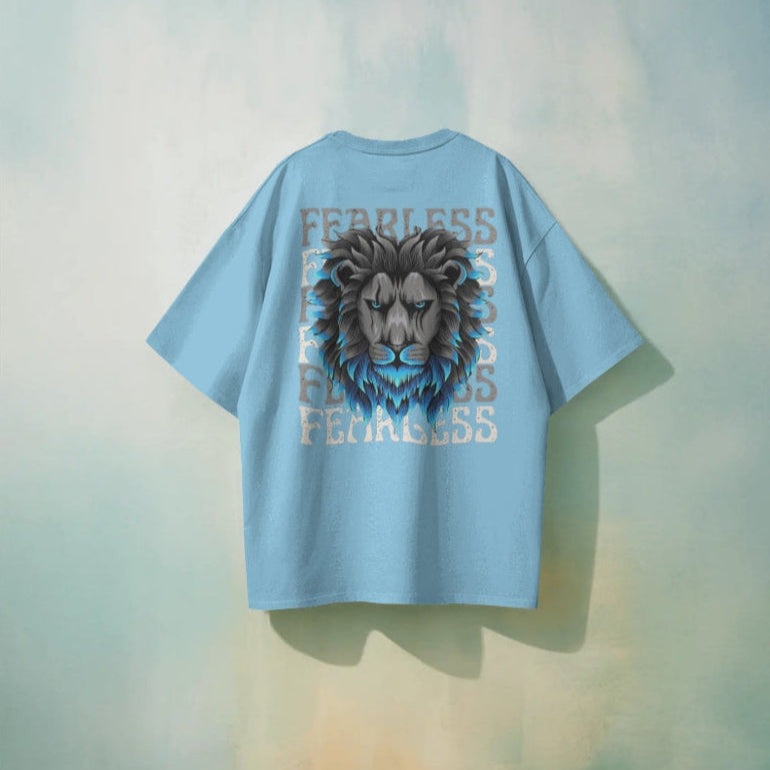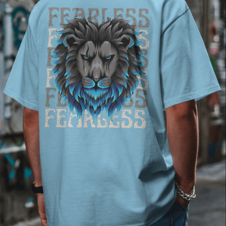 Powerful Graphic Statement – A dynamic lion design, accented in vivid blue, roars across the back, layered over a repeated “FEARLESS” motif.