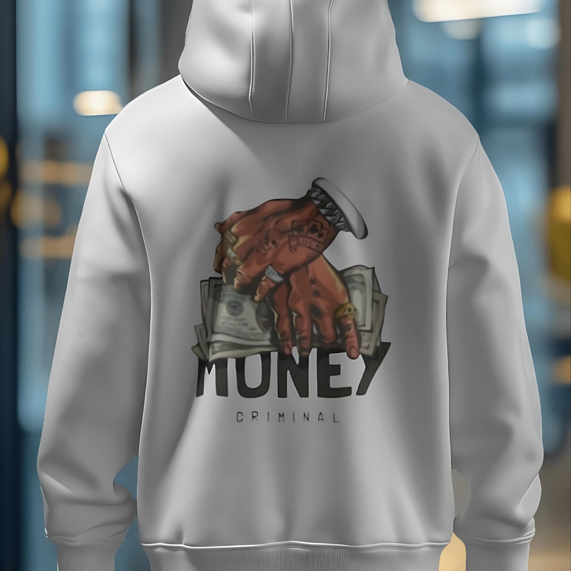 Features a high-resolution graphic print on the back, showcasing tattooed hands gripping money, symbolizing ambition and grit. Finished with bold “MONEY” and “CRIMINAL” typography for a fearless urban edge.