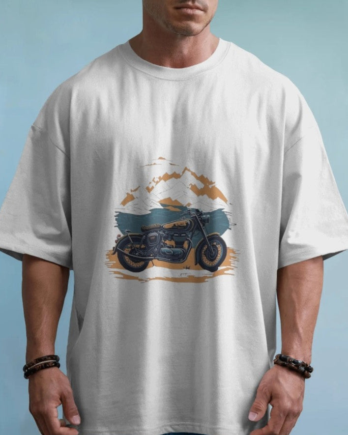 The "Ride Beyond" oversized t-shirt captures the essence of freedom and road adventure. Featuring a detailed vintage motorcycle graphic set against a mountain backdrop, this piece is designed for those who live with purpose and ride with passion.